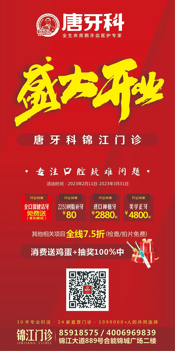 2023年2月11日,唐牙科迎來旗下又一新店——錦江門診的盛大開業(yè)!預(yù)示著唐牙科的發(fā)展再上新臺階,更好地、更近距離地服務(wù)成都人民。